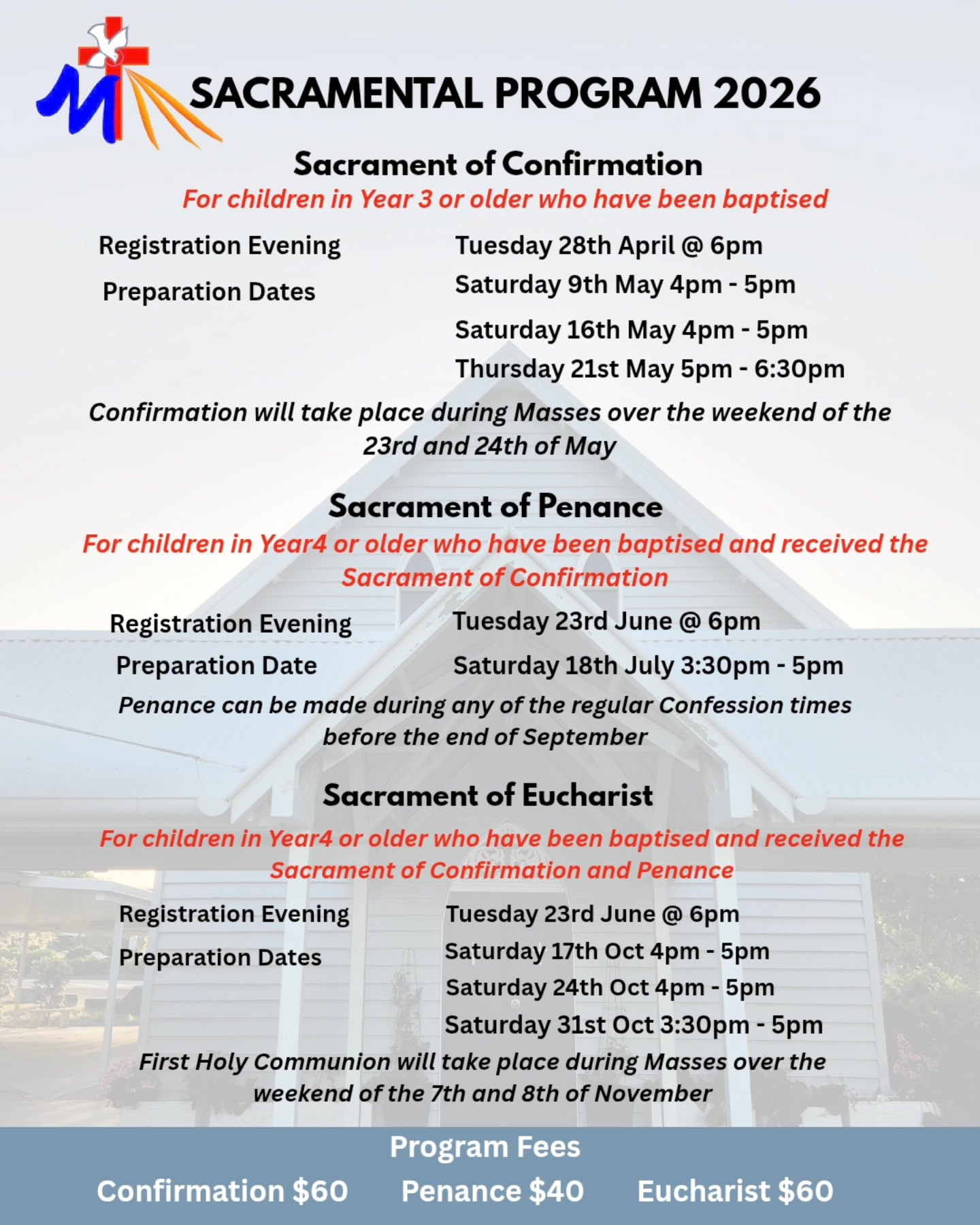 - Once registered, it is a requirement that children attend EVERY preparation session to be eligible to receive the sacraments. Please consider this when making holiday plans etc.